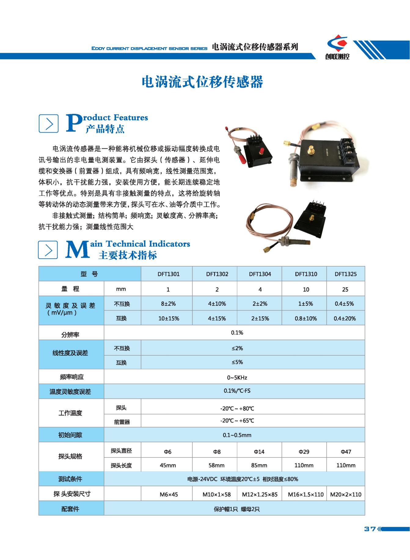 电涡流传感器是一种能将机械位移或振动幅度转换成电讯号输出的非电量电测装置。它由探头(传感器)、延伸电缆和变换器(前置器)组成,具有频响宽,线性测量范围宽,体积小,抗干扰能力强,安装使用方便,能长期连续稳定地工作等优点。特别是具有非接触测量的特点,这将给旋转轴等转动体的动态测量带来方便,探头可在水、油等介质中工作。 非接触式测量;结构简单;频响宽;灵敏度高、分辨率高;抗干扰能力强;测量线性范围大